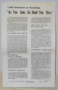 New York: Youth Against War and Fascism 1970. Legal size sheet printed on one side single horizontal fold else very good condition. Argues that the ruling class has brought upon itself the bombings by radical domestic groups. "You murdered Fred Hampton. You committed the My Lai massacre. Retaliation is inevitable. Your vaults are filled with stolen loot. You brought it upon yourself. Youth Against War and Fascism unknown books