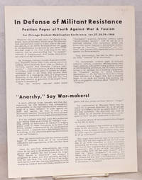 New York: Youth Against War and Fascism 1968. 4p. 8.5x11 inches very good. Argues that "acceptable" methods of protest and passive resistance are chains on the antiwar movement and defends against charges of adventurism or fears of alienating the working class through more direct action against draft centers companies with ties to the military etc. Youth Against War and Fascism unknown