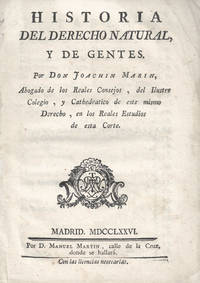 Madrid: Manuel MartÃn 1776. 201x153mm. 8x6". Madrid Manuel MartÃn 1776. En 4º 201 x 153mm. 4 60 pp. la última blanca. Guardas de papel. Primera edición de este famoso opúsculo tocante al derecho natural y de gentes. El derecho natural es el que se aplica a todos los animales incluido el hombre en lo que tiene de animalidad; el derecho de gentes es el que se ejerce sobre los hombres en tanto que racionales. JoaquÃn MarÃn y Mendoza 1727-1782 fue abogado de los Reales Consejos académico de la Historia y alcalde del Crimen. La obra de JoaquÃn MarÃn interesa sobre todo como "exponente de una situación que predominaba en los cÃrculos dirigentes y en las capas cultas de la España del siglo XVIII con respecto al derecho natural racionalista" Manuel GarcÃa Pelayo. Una vez creada la nueva disciplina de Derecho Natural y de Gentes en los Reales Estudios de San Isidro de Madrid con el objeto de demostrar la unión necesaria de religión moral y polÃtica MarÃn quiso ofrecer un epÃtome de su origen y progreso de los autores y sus doctrinas y de sus sistemas y métodos principales presentando una "guÃa segura" a los que buscaban conocer los primeros elementos de esta ciencia. Con claridad y sencillez acertó a difundir esta ciencia nueva europea forjada en los siglos xvii y xviii en la lÃnea divulgativa de la época emprendida por Vattel Burlamaqui o Almici. Buen ejemplar. Manuel MartÃn unknown