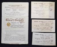 Philadelphia: Artisans Order of Mutual Protection 1910. Very Good. 1 pamphlet relating to the Dec. 6 1910 meeting of the Girard Assembly Number Six of the Artisans Order of Mutual Protection held in Philadelphia. Payment of dues by W. R. Spratt is recorded. Spratt is listed in the Roll of Honor. Officers are listed on the 4th page. With 3 slips recording Spratt's payments in 1910 and 1911. Each is signed by Joseph Reese the recorder. The Artisans Order of Mutual Protection established in 1873 is the second oldest fraternal insurance organization in the United States. In 1910 as described in the pamphlet membership was available to white men between 18 and 50 years "physically sound of good moral character and having a firm belief in the existence of a Supreme Being." In Very Good Condition: light folding; lower edges of pamphlet creased with small closed tears; clean and intact. Artisans Order of Mutual Protection unknown