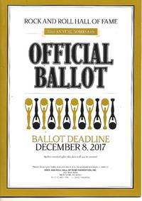 New York: Rock and Roll Hall of Fame Foundation 2017. Book. Fine. Soft cover. 1st Edition. 10h x 7w. A real nice clean 20 page ballot book. The ballot was turned in so back cover is only half there. Has black and white photos of 20 nominees with their song list and a bio of the people. Some of those listed are MC5 the Zombies Sister Rosetta Tharpe Moody Blues Radiohead Kate Bush and others. Rock and Roll Hall of Fame Foundation Paperback